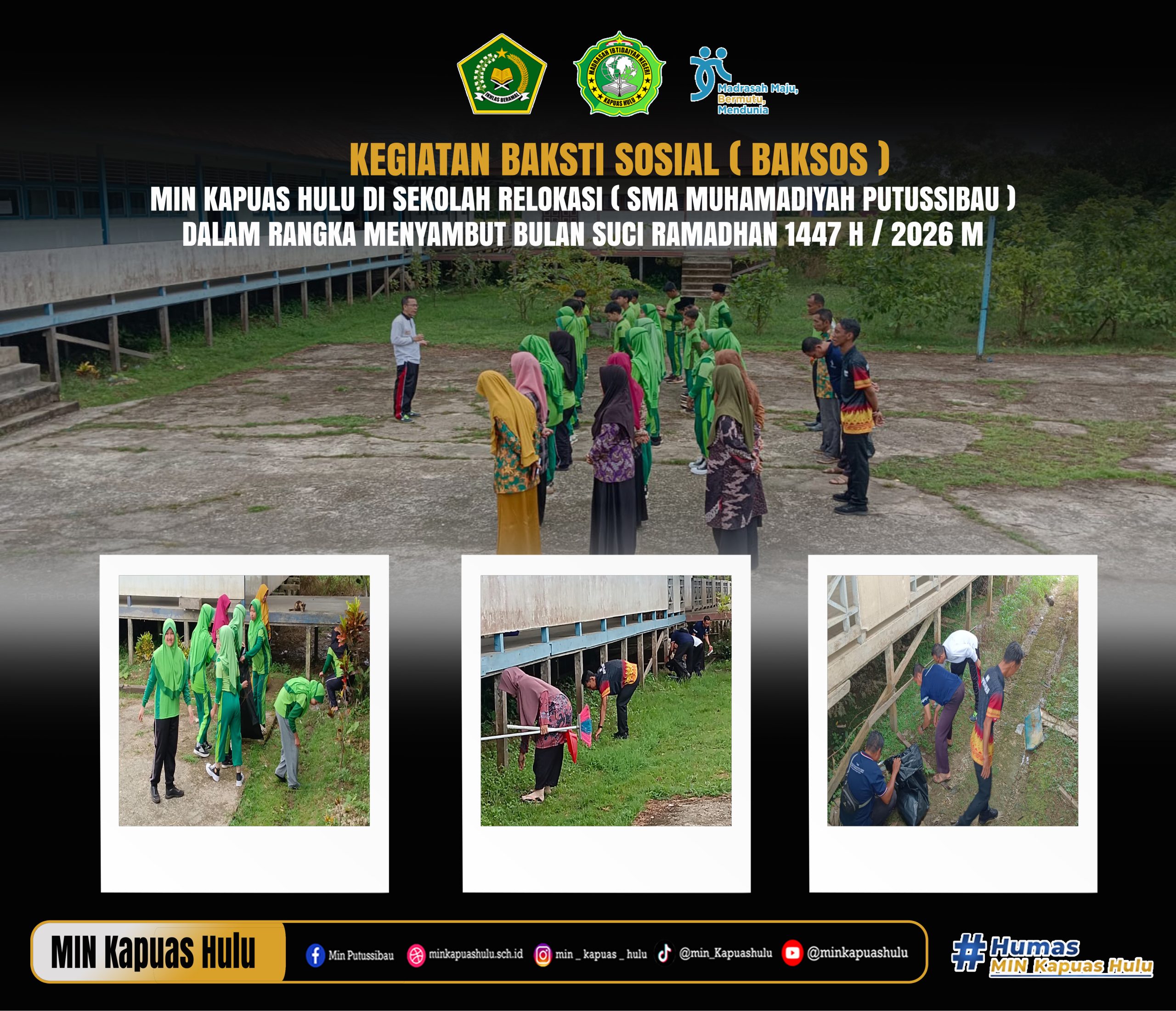 Dalam rangka menyambut datangnya Bulan Suci Ramadhan 1447 H/2026 M, Madrasah Ibtidaiyah Negeri (MIN) Kapuas Hulu menggelar kegiatan bakti sosial berupa aksi bersih-bersih lingkungan sekolah relokasi di SMA Muhammadiyah Putussibau, Kamis pagi (12/2/2026). Melalui kegiatan bakti sosial ini, MIN Kapuas Hulu menunjukkan komitmennya dalam membangun lingkungan pendidikan yang bersih, sehat, serta mempererat kebersamaan antar guru dan siswa dalam menyongsong bulan suci Ramadhan dengan penuh kesiapan dan semangat kebajikan. *HumasMINKH