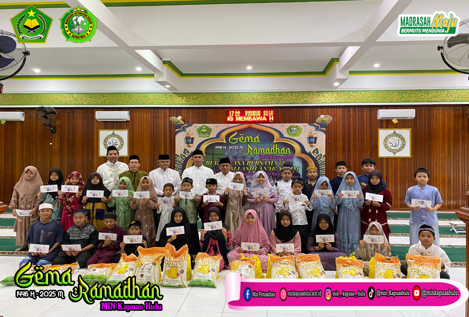 Madrasah Ibtidaiyah Negeri (MIN) Kapuas Hulu sukses menggelar acara penutupan Program Gema Ramadhan 2025 dengan kegiatan Tali Asih bagi anak yatim serta kurang mampu, serta buka puasa bersama. Acara ini berlangsung pada hari Kamis, 20 Maret 2025, di Masjid Al-Ikhlas Putussibau.